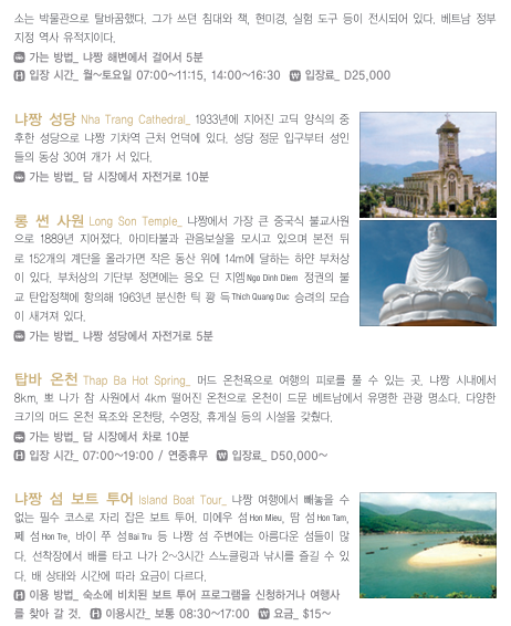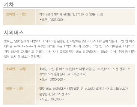 나트랑(냐짱) 방문시 항공, 기차 등 교통 정보입니다.(가이드북이 예전거라 우리나라에서 직항이 없다고 표시되어있는데 최근에는 직항이 생겨서 편하게 가실 수 있습니다.)
