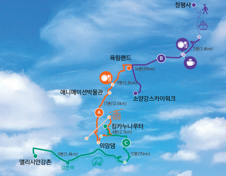 1. 육림랜드 → 2. 애니메이션박물관(토이로봇관) → 3. 춘천 삼악산 호수 케이블카