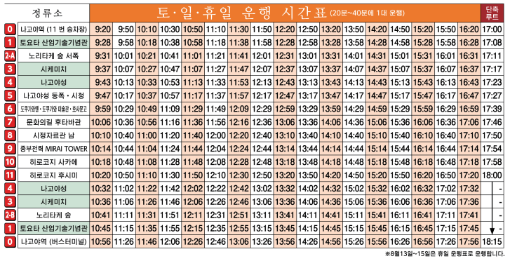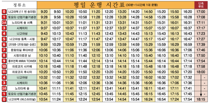 나고야 메구루 운행 시간표는 아래와 같습니다.