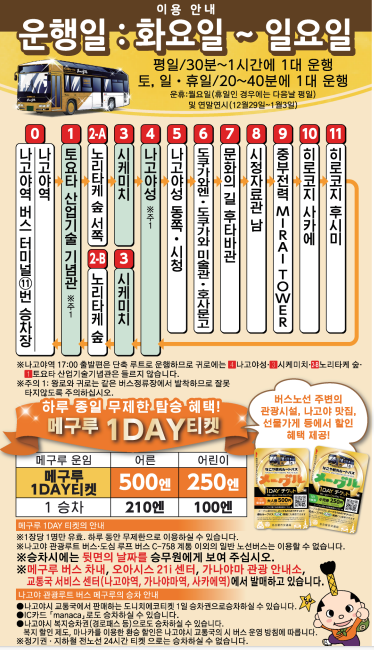 나고야 메구루 운행일은 화요일 부터 일요일까지입니다.