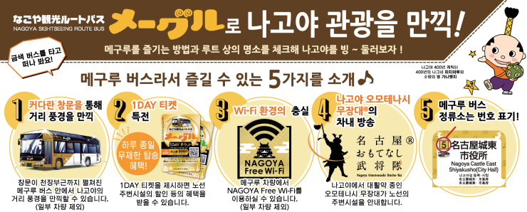 아이치현 최대 도시이자 일본에서 4번째로 큰 도시인 나고야는 일본 교통의 중심지라고 할 수 있습니다. 근대 일본의 모습을 잘 볼 수 있는 나고야는 관광객들의 편의를 위해 관광버스(메구루)를 운행하고 있습니다.