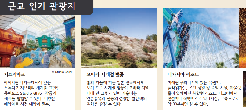 나고야 인근에도 유명한 관광지가 많습니다. 나고야에서 가기 좋은 근교 인기 관광지 정보입니다.
