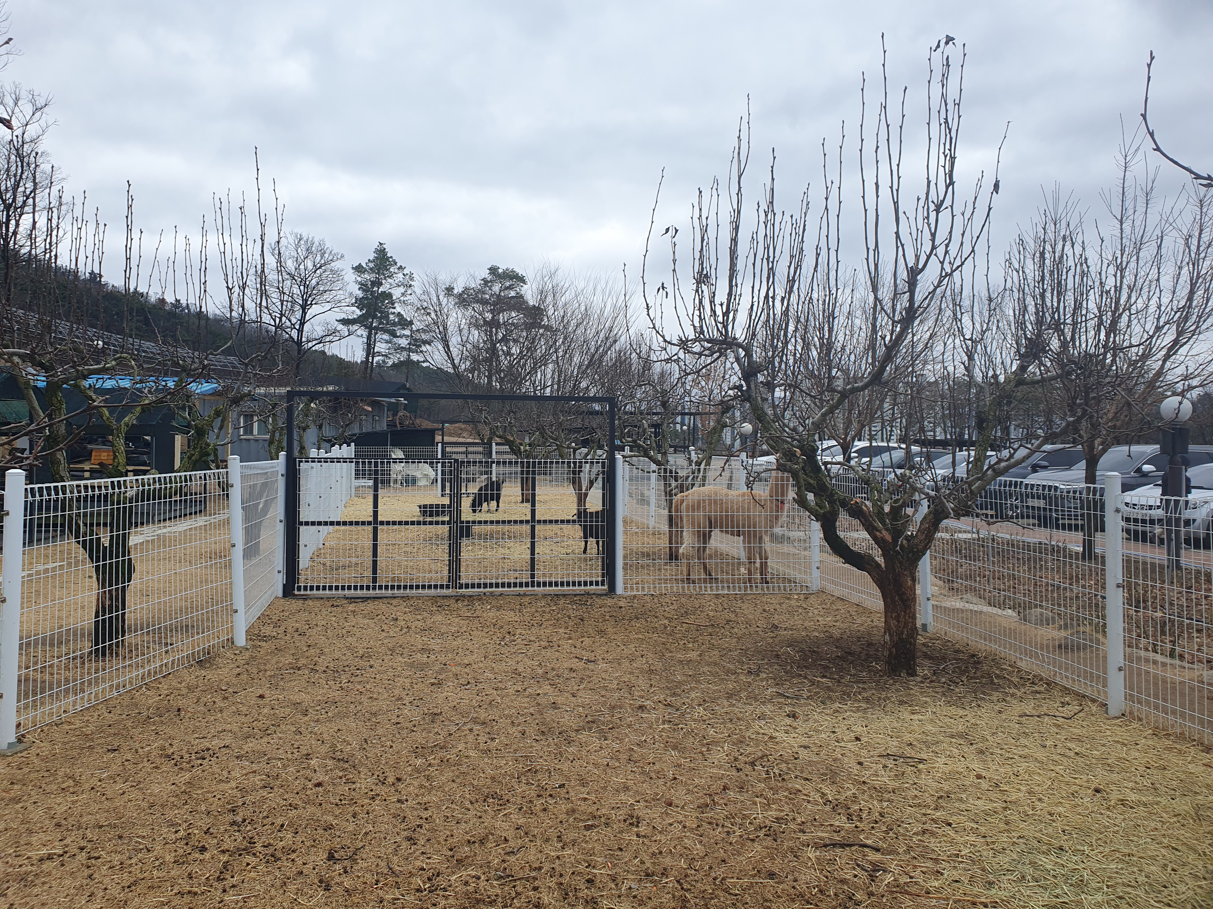 카페 바로 앞 마당에 농장이 있는데 거기에 알파카와 염소들이 있습니다.