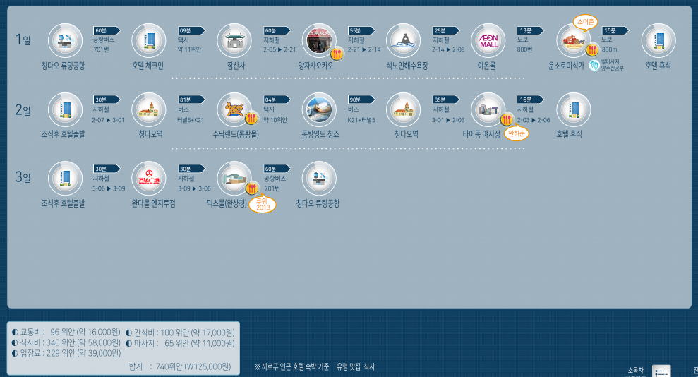 칭다오 방문시 2박 3일 추천여행 코스는 아래와 같습니다. 아래와 같이 여행할 시에 대략적인 비용도 나와있습니다.