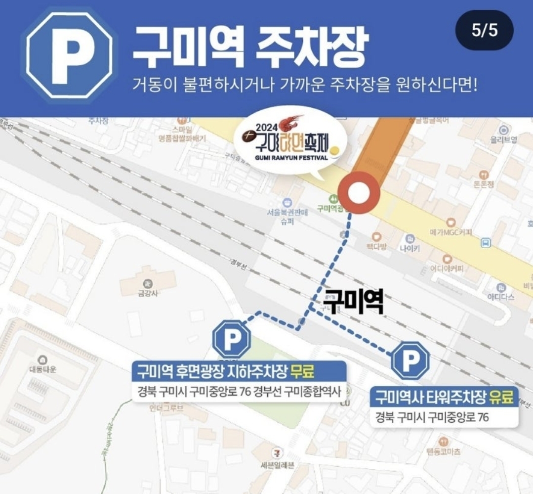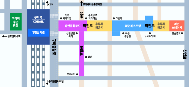 구미라면 축제는 구미역에서 열리는데 구미역을 중심으로 인근 도로가 행사장으로 사용될 예정입니다.