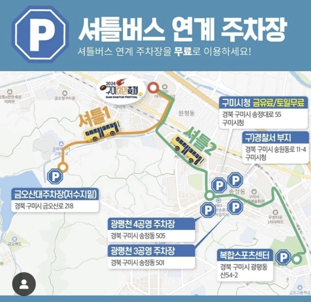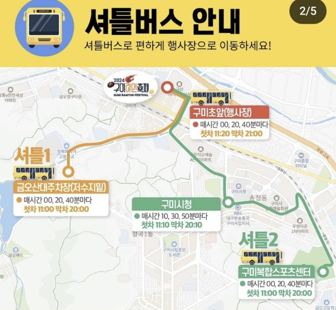행사때 많은 사람들이 몰릴것으로 예상되는데요. 구미시에서 셔틀버스 운영한다고 하니 교통혼잡을 피해 셔틀버스를 타시는게 좋을듯 합니다.